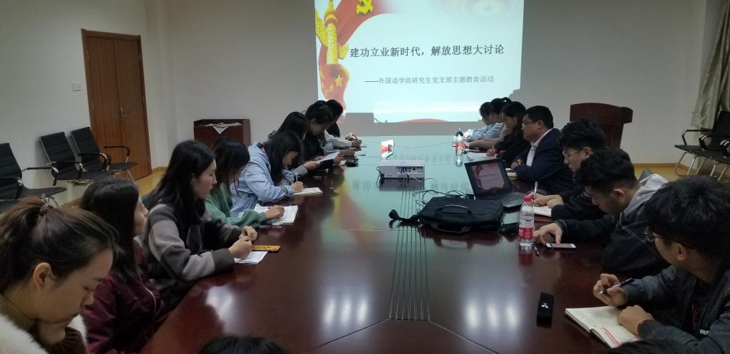 2018年10月29日,350vip8888新葡的京集团研究生党支部在党员开展了以“建功立业新时代,解放思想大讨论”主题教育活动,本次学习采取视频观看和学习讨论相结合的方式,由党支部书记宋飞同志主持。