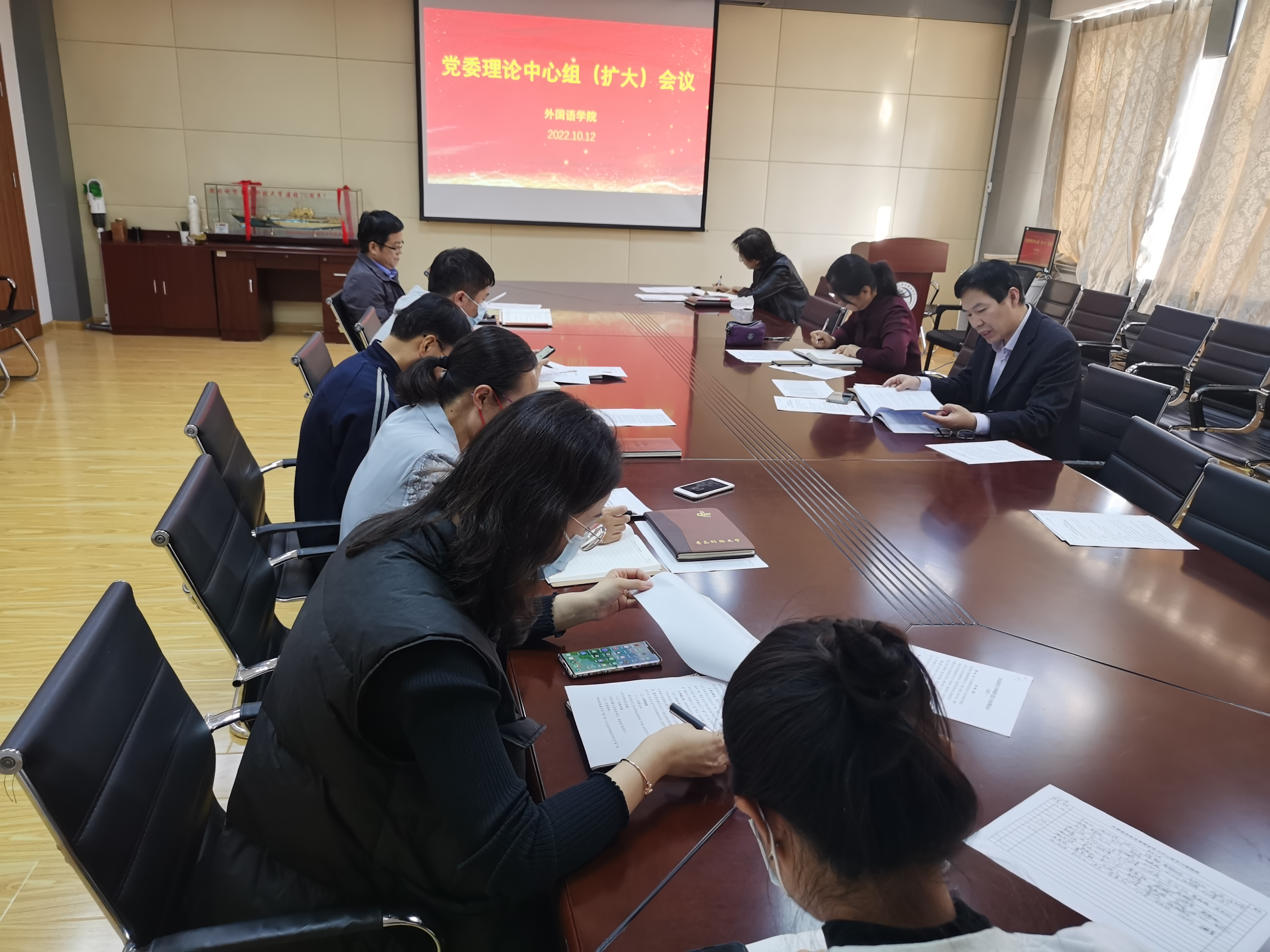 10月12日下午,350vip8888新葡的京集团党委理论学习中心组(扩大)在学院517会议室举行集体学习,集体学习由学院党委书记曲斌艳主持,学院党委委员及政治辅导员参加。