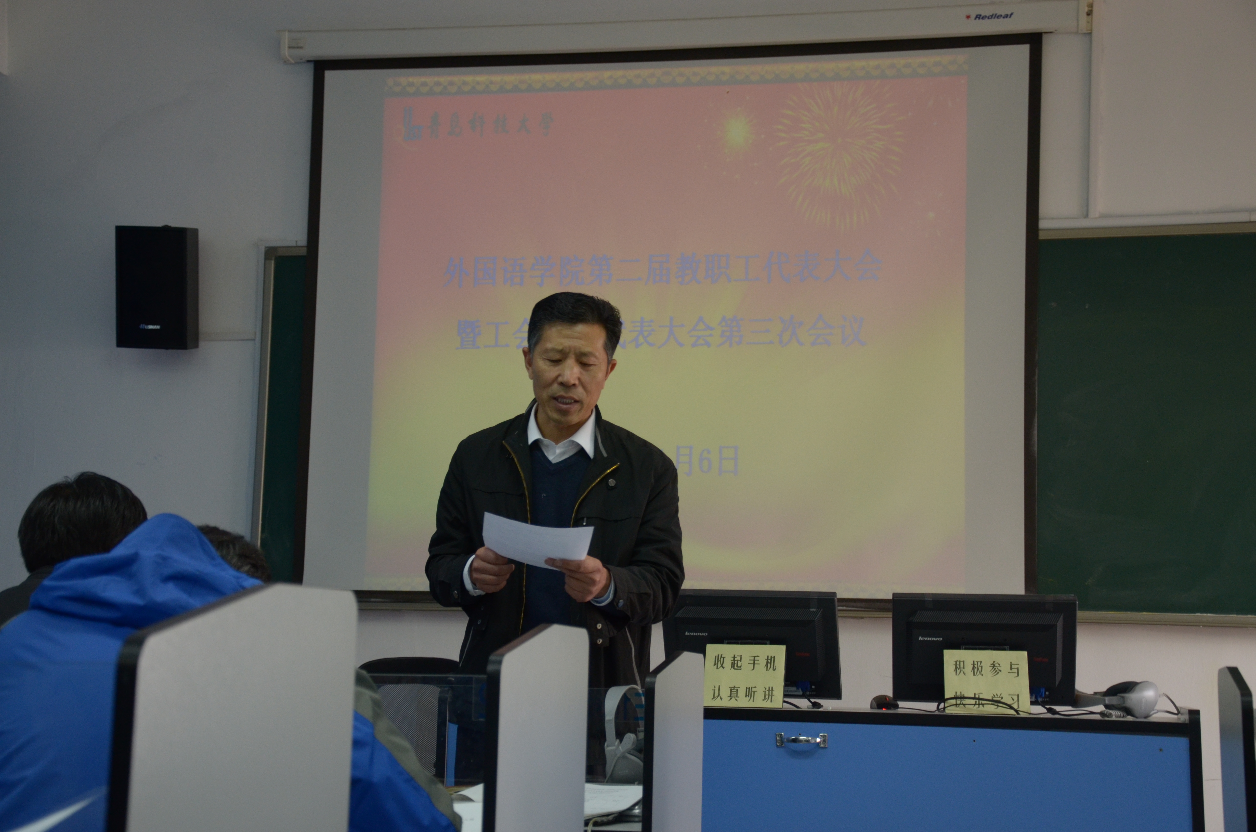 2015年1月6日下午,350vip8888新葡的京集团在南区3#418教室召开学院第二届教职工代表大会暨工会会员代表大会第三次会议。学校工会副主席李小华同志出席会议,院长姜德杰主持预备会议,党总支书记许桂锋主持正式会议。