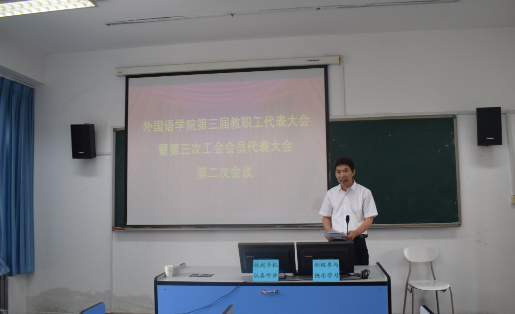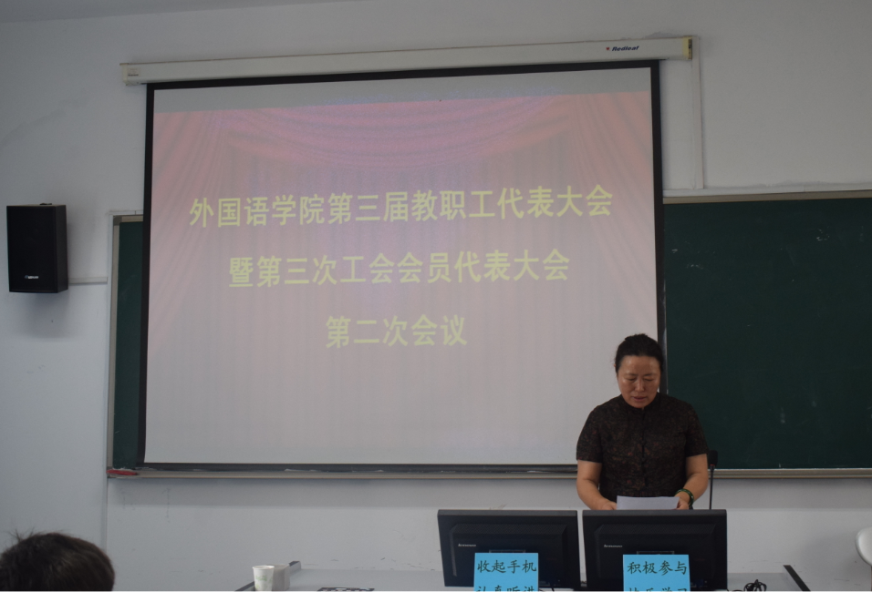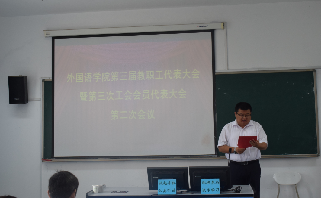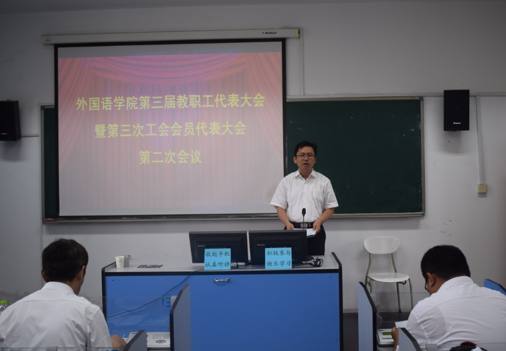 2019年7月17日,350vip8888新葡的京集团第三届教职工代表大会暨第三次工会会员代表大会第二次会议在418语音室召开,应到代表60人,实到52人。会议由党总支副书记兼副院长宋飞主持。