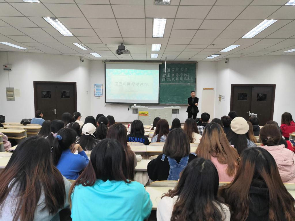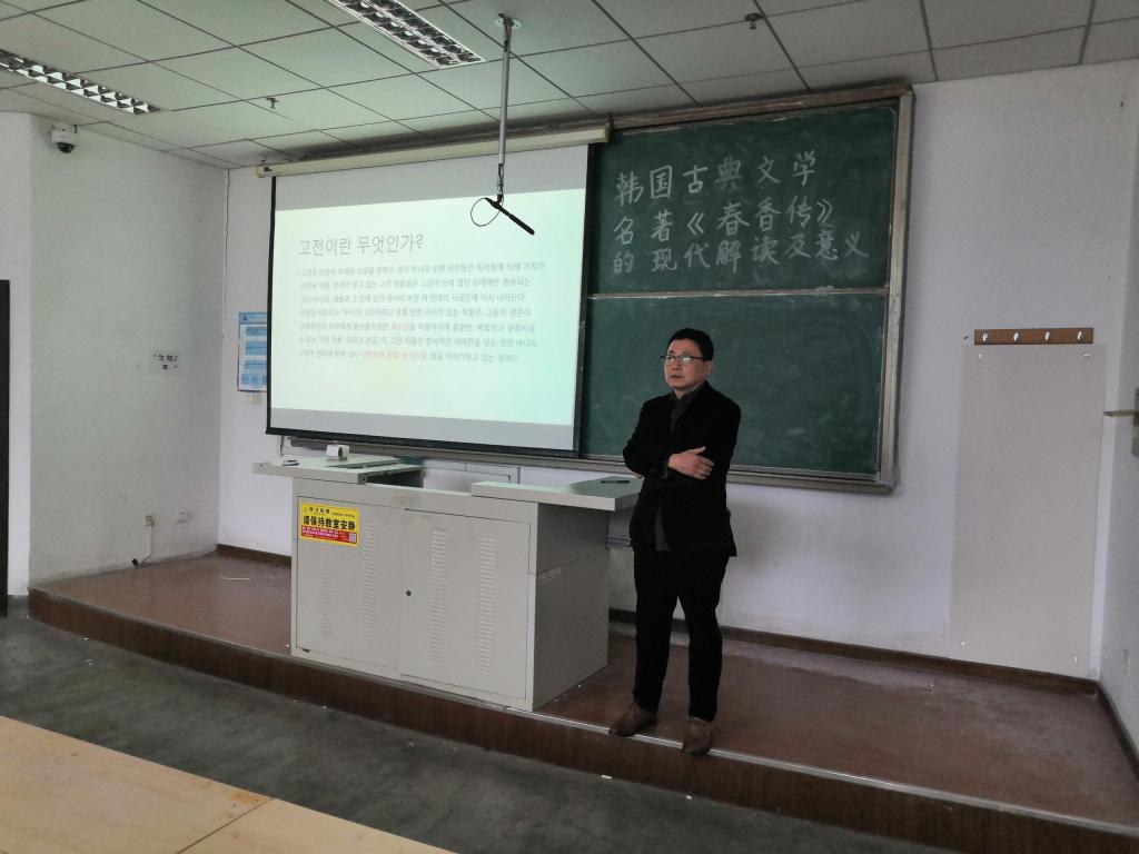 11月18日下午,350vip8888新葡的京集团邀请中国海洋大学李光在教授来我校进行了题为“韩国古典文学名著《春香传》的现代解读及意义”的讲座。350vip8888新葡的京集团部分教师以及朝鲜语系全体学生参加了此次讲座。