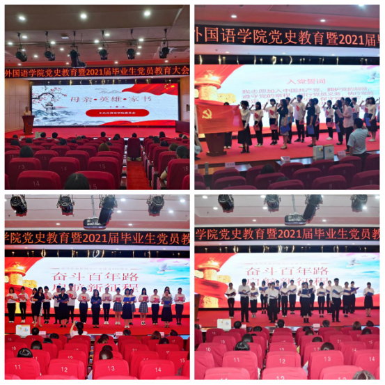 学习百年党史,汲取奋进力量 为教育引导毕业生从党史学习教育中汲取智慧和力量,肩负历史使命,坚定前进信心,350vip8888新葡的京集团举办了“奋斗百年路 启航新征程”党史学习教育暨2021届毕业生党员教育大会。学院党委书记曲斌艳以“母亲·英雄·家书”为题,为全体毕业生党员上了离校前的“最后一堂党课”,勉励广大毕业生党员要牢记入党初心,坚定理想信念,立大志、明大德、成大才、担大任,努力成长为合格的的社会主义建设者和接班人。她寄语大家从党史学习教育中汲取智慧和力量、努力奋斗,以实际行动和优异的成绩为党旗增辉,为母校添彩,向党的百年华诞献礼!曲斌艳带领全体毕业生党员面向党旗重温入党誓词,铮铮誓言,让党员们再一次感受党的神圣光辉,更加坚定入党信念和为共产主义事业奋斗终身的决心。学院教工党员代表带领同学们用中、英、德、俄、日、朝鲜语六种语言集体朗读《共产党宣言》,全体毕业生党员集体献词《百年芳华逐梦而行》,铿锵有力的声音带我们回顾了百年来中国共产党带领人民走过的光辉历程和取得的辉煌成就。