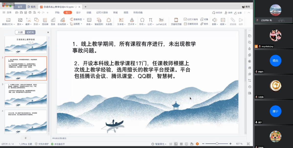 随后蒋晓青老师根据学校督导组和学院线上听课要求的安排,结合学院督导组听课情况进行了汇报。她指出,本次线上教学整体情况良好,授课平台运行平稳,过程流程,老师们态度认真,备课充分,课件设计精良,但也存在一定问题:个别老师授课平台信息上报不完整或更新不及时,授课内容单一,翻转课堂时间过程,在线互动效果不佳。
