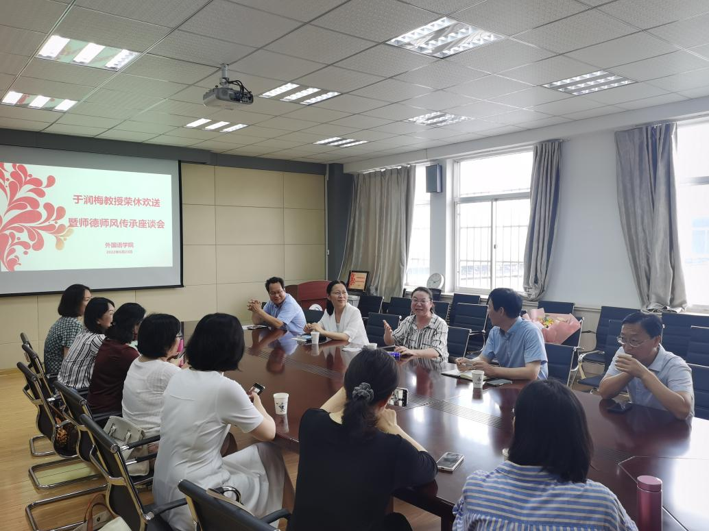 6月23日上午,350vip8888新葡的京集团举办于润梅教授荣休欢送暨师德师风传承座谈会。退休教师于润梅教授、学院领导班子成员以及外语系教师参加,院长尹洪山主持。