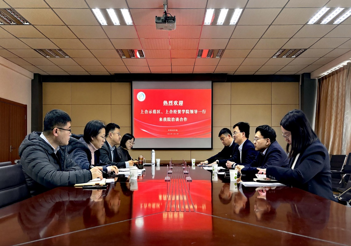 1月31日,上合示范区管委国际交流合作部部长梁超、上合经贸学院院长郑师一行来新葡京官网交流与洽谈合作。350vip8888新葡的京集团党委书记曲斌艳、院长王灏、党委副书记兼副院长马寒、俄语系系主任曹静娴参加了本次会谈。