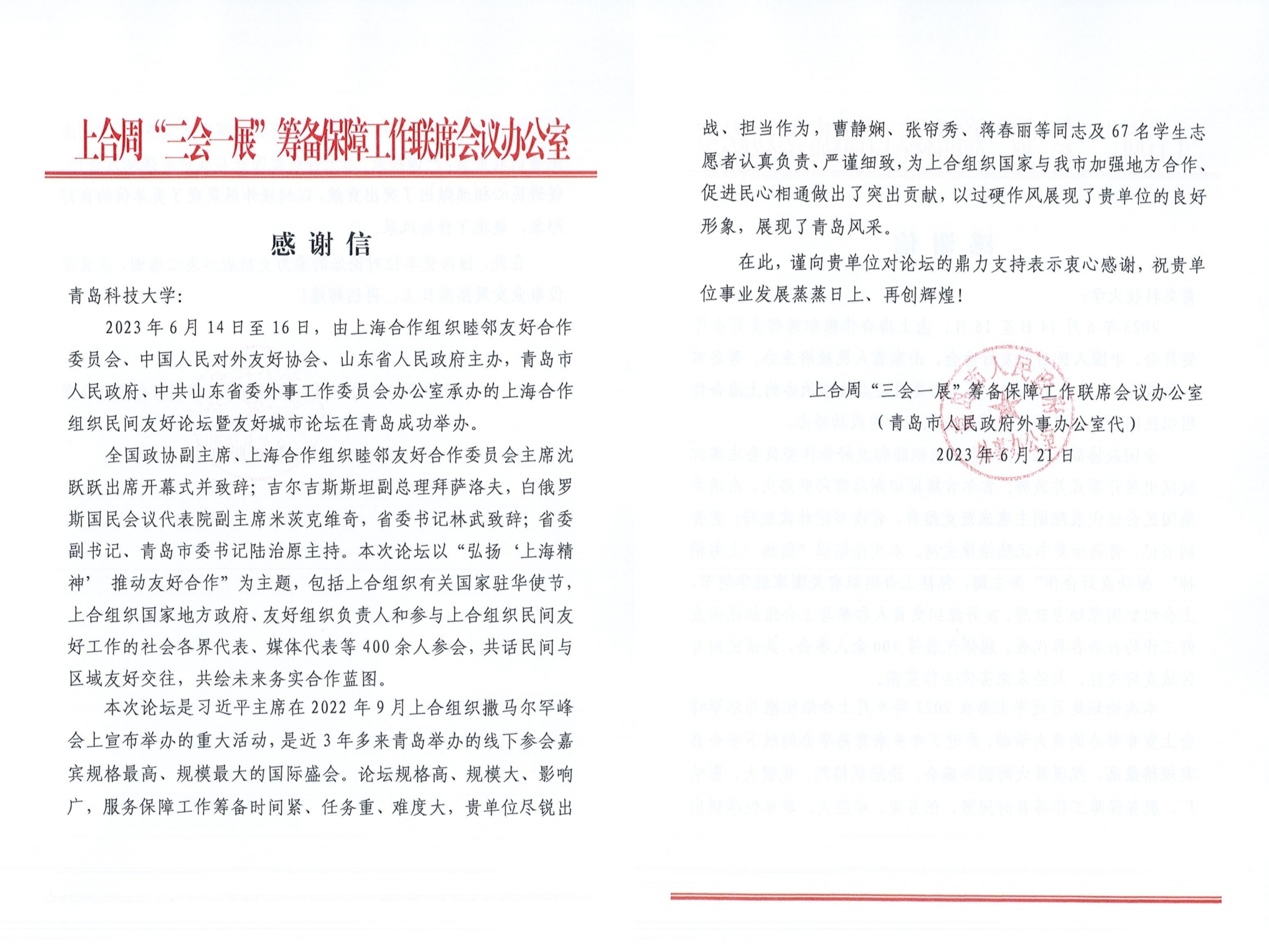 近日,350vip8888新葡的京集团收到青岛市外事办感谢信,对学校给予上海合作组织民间友好论坛暨友好城市论坛的鼎力支持表示感谢,对350vip8888新葡的京集团师生在论坛期间的出色表现给予了肯定。
