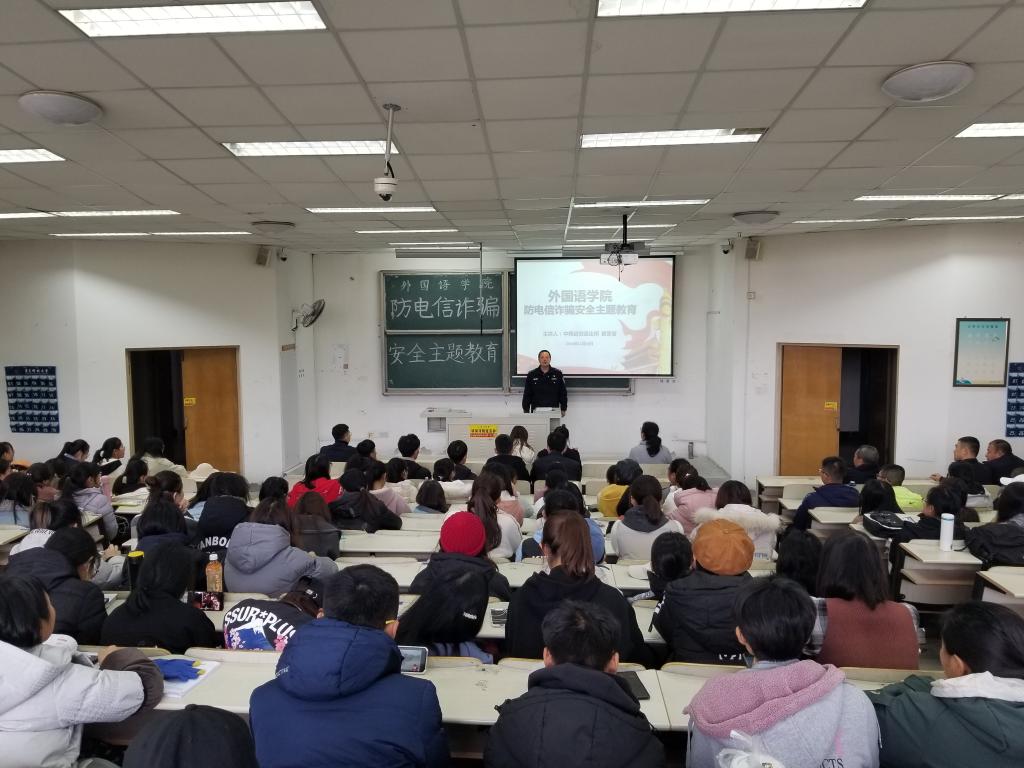 为了提高学生防诈骗意识,构建平安和谐校园。11月26日,350vip8888新葡的京集团于弘毅楼E202举办防电信诈骗安全教育专题讲座。中韩边防派出所崔睿警官担任主讲人,350vip8888新葡的京集团2019级全体学生参加了讲座。