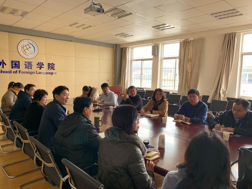 11月25日上午,学校教务处王霞处长带领教务处领导班子成员一行7人来新葡京官网调研和座谈。 座谈会由尹洪山院长主持,副院长任素贞、康宁,院长助理刘靖及部分教师代表参加了座谈。