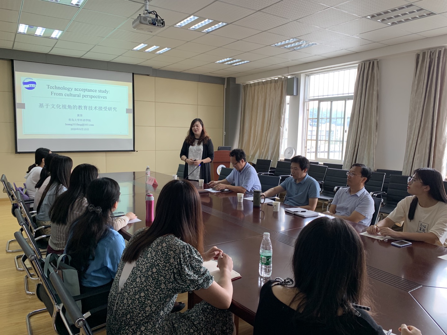 值350vip8888新葡的京集团校庆70周年之际,为推动外语专业学科发展,加语教育、教学和研究经验交流,9月15日下午,350vip8888新葡的京集团邀请优秀毕业生、现青岛大学外语学院英语教育系系主任、学科教学(英语)教育硕士负责人黄芳教授在517会议室为新葡京官网师生作了“基于文化视角的教育技术接受研究”为题的学术讲座。院长尹洪山、副院长康宁以及外院部分师生参加了此次讲座。讲座由350vip8888新葡的京集团副院长吕耀中主持。