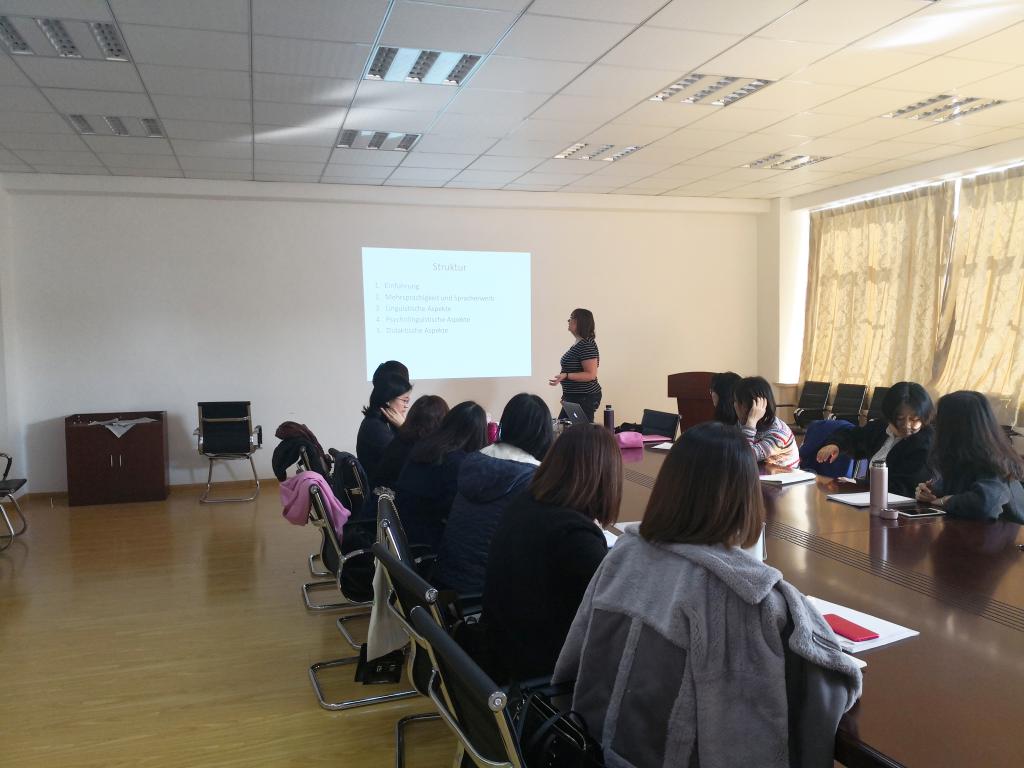 10月27日至11月3日,德国班贝格大学Susanne Borgwaldt教授应邀在新葡京官网进行了为期一周的访学,期间共举办了三场学术报告,主题分别为《德国的多语化(Mehrsprachigkeit in Deutschland)》、《德语构词法之复合词(Wortbildung-Komposition)》和《二语习得研究心得(L2-Erwerb)》,并围绕《多语化和第三语教学(Mehrsprachigkeits- und Tertiärsprachendidaktik)》这一主题开展了为期三天的教师培训,350vip8888新葡的京集团德语系全体教师及部分中德科技学院、中德双元工程学院的德语教师参加了此次培训。经过一周的学习与交流,师生们都感到受益颇丰。