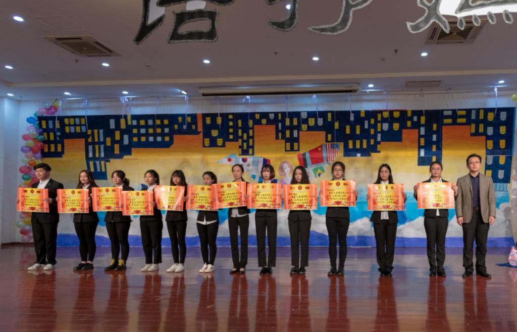 李志新等同学用五国语言演绎的歌曲串烧《青春的歌》,优美动听,充分展现了外院特色。歌曲《往后余生》、部长舞《We Are Yong》,表达了当代大学生们对美好生活的追求和向往。形式新颖的荧光舞《strike back》,将科技与现实相结合,赢得了全场观众的阵阵掌声。学院外文广播电台的同学们表演的歌舞《hallow and hello》,这些发音标准的外语播音员用青春活力的舞蹈给大家带来了不一样的体验;特别值得一提的是来自全体辅导员、学生会主席团同学表演的歌曲《彩虹》,传递着外院师生潮气蓬勃,追求梦想的信念,将晚会推向了高潮。演出在合唱《歌唱祖国》中落下帷幕。
