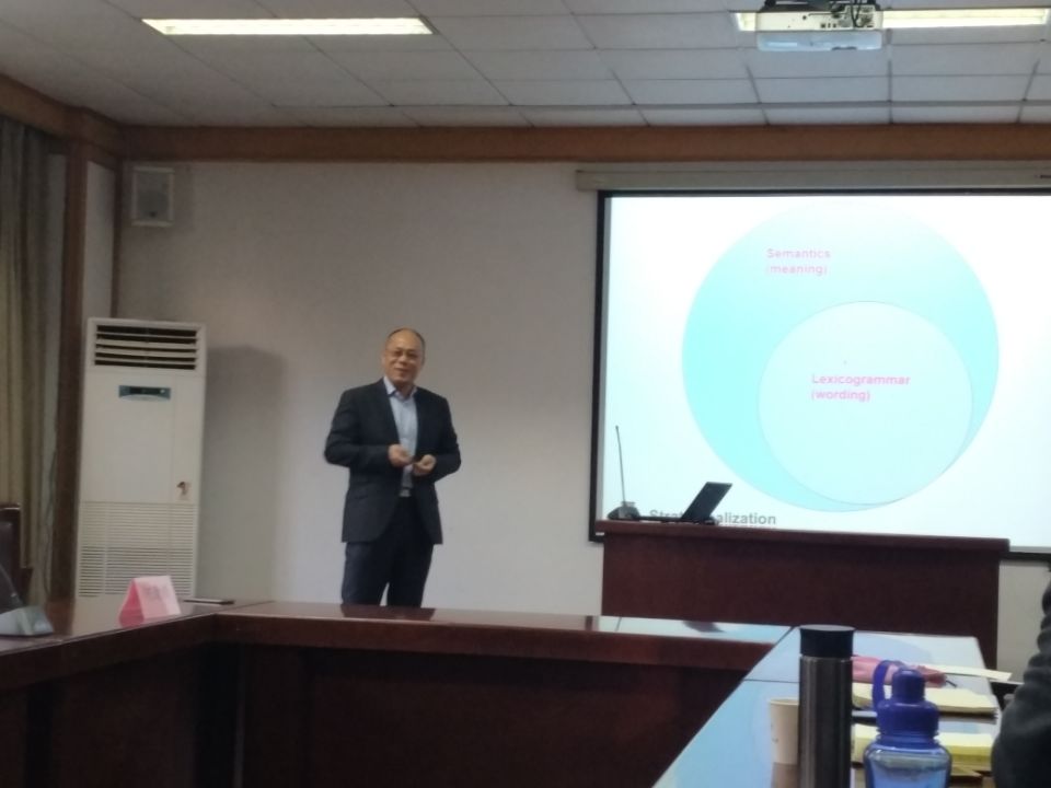 11月22日下午,中山大学“百人计划”杰出人才,博士生导师何清顺应邀来新葡京官网进行学术交流,在经管楼313会议室做了一场题目为“名词化还是动词化——基于语料库的英语概念语法隐喻与语篇技术性之相关性研究”的学术报告。报告会由350vip8888新葡的京集团院长尹洪山主持,副院长康宁,350vip8888新葡的京集团梁晓鹏教授以及部分教师与学生参加了这次讲座及交流。