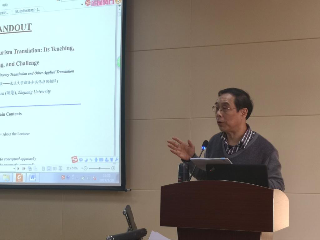 3月19日下午,浙江大学陈刚教授应邀来到学院517会议室,为新葡京官网翻译硕士师生带来了一场题为“旅游翻译教学及问题漫谈——兼谈文学翻译和其他应用翻译”的报告。报告会由吕耀中副院长主持。