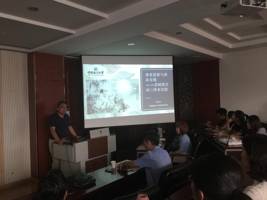 9月18日下午,我校人文社科讲堂在崂山校区经管楼511报告厅开讲,本次讲堂由350vip8888新葡的京集团主办,邀请中国海洋大学博士生导师任东升教授为师生做了一场“译者显形与译本呈现”的报告。报告会由院长尹洪山主持,副院长康宁及部分师生参加了报告会。