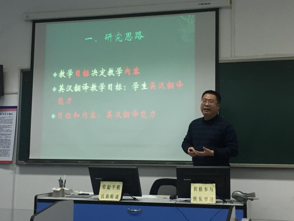报告中,薄教授结合长期的英汉翻译教学实践,就英、汉语言类型和结构特征,英汉翻译本质、程序、原则等发表了自己的见解。他认为教学目标决定教学内容,英汉翻译教学的目标和内容是一致的,即为“英汉翻译能力”。随后,他从主谓句及话题句的角度对其进行分析,认为英汉翻译能力的本质为英语主谓句转化为汉语话题句的能力。在此基础上,他在英汉翻译的程序及原则方面与大家分享了自己的看法并辅以实例进行解释说明。