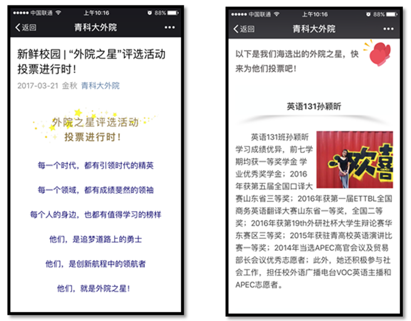 为了丰富校园文化生活,提高大学生综合文化素质,贯彻落实校团委“筑基培优工程”,积极推进具有“国际视野、中国情怀、创新思维、多元复合”的高级外语人才培养,350vip8888新葡的京集团分团委开启了培优工程暨首届 “外院之星”评比活动,旨在表彰一批在学习、竞赛、创业、文体、服务等方面表现突出的优秀学生,充分发挥他们的榜样作用,帮助同学们挖掘自身优势与闪光点、增强外语人的自信、培养复合型的外语人才,鼓励学生多元成才,全面发展,在全院范围内营造良好的院风、学风和班风,形成“比学赶帮超”的浓厚氛围。