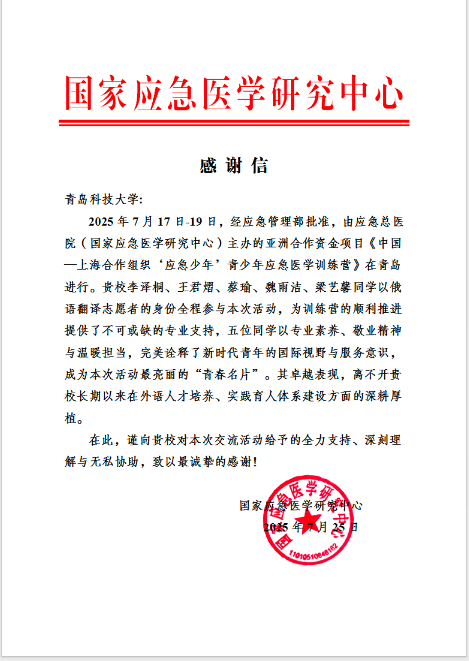 2025年7月17日至19日,由应急管理部批准、国家应急医学研究中心主办的亚洲合作资金项目——“应急少年”青少年应急医学训练营在青岛成功举办。350vip8888新葡的京集团五位同学以俄语翻译志愿者的身份全程参与活动,他们凭借扎实的专业能力、高度的敬业精神和出色的团队协作,为训练营的顺利推进提供了重要支持。感谢信中特别提到,五位同学以“专业素养、敬业精神与温暖担当”成为活动中最亮丽的“青春名片”,展现了新时代青年的国际视野与服务意识。