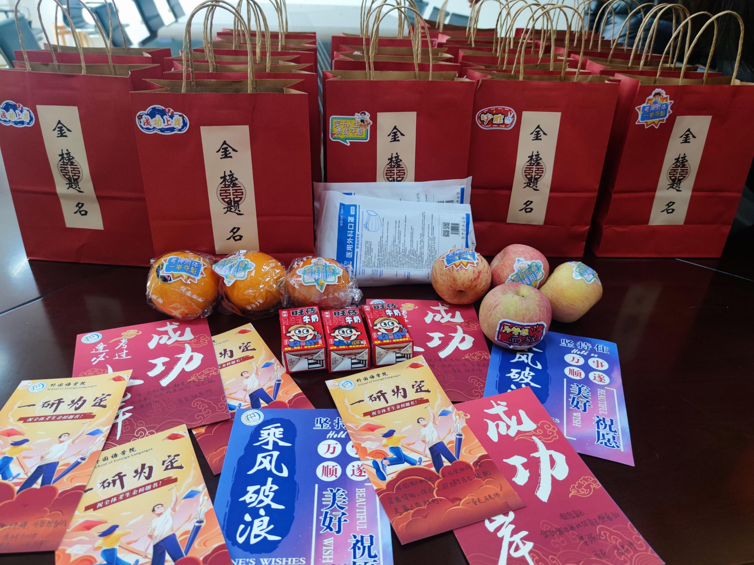 考研既是一次人生的重要挑战,也是人生的一次重要的转折点;既是人生的重要阶段之一,也是实现梦想的重要一步。在这一关键时期,学院领导和老师们对此高度重视,亲切询问同学们的备考进度、心理状态,勉励同学们全力以赴、劳逸结合,以最好的精神面貌迎接考试。学院师生为即将踏上考场的同学们送上精心准备、专属定制的考研助力加油包:辅导员老师亲笔手写加油卡片、新鲜水果、零食、口罩……