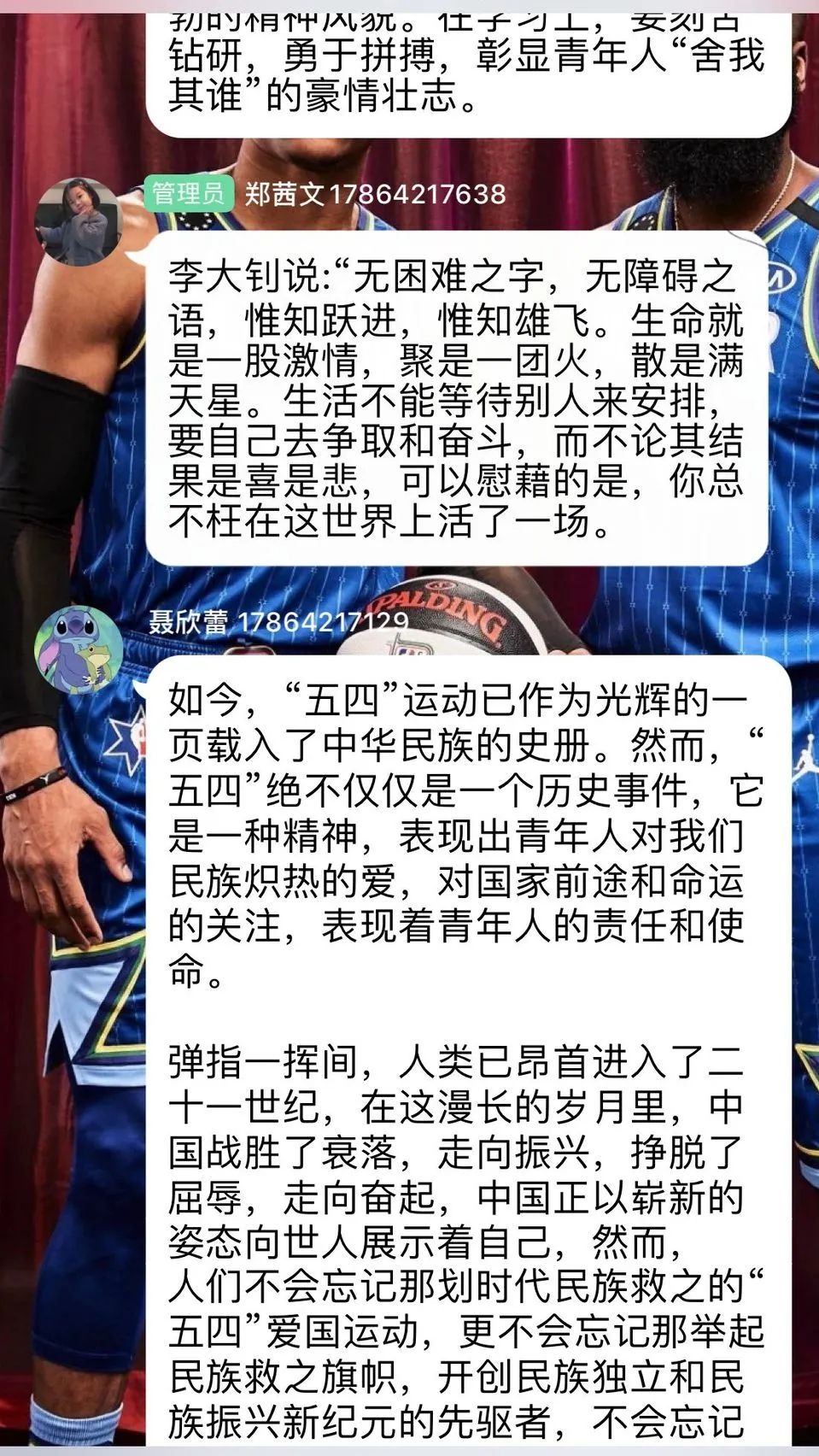 伟大的时代需要一代代人接续奋斗,共同建设。今日之青年,处在大好时代,当不负青春韶华,争做时代先锋。百年凌云志,吾辈当秉承。我中华儿女也应有所志气,奋勇博青春,有一分热,发一分光,就令萤火一般,在黑暗里发一点光,不必等候炬火。青春由磨砺而出彩,人生因奋斗而升华,愿以吾辈之青春护卫这盛世之中华,传承五四精神,绽放青春力量!