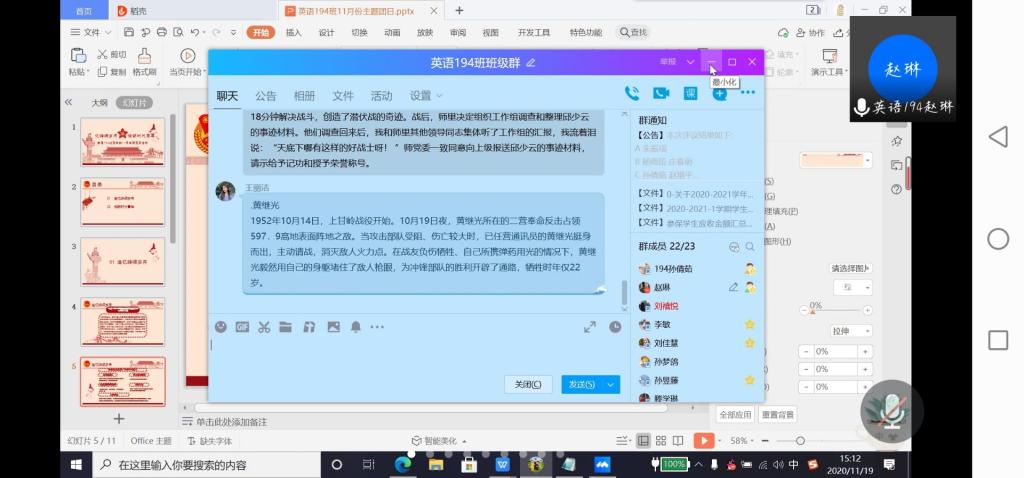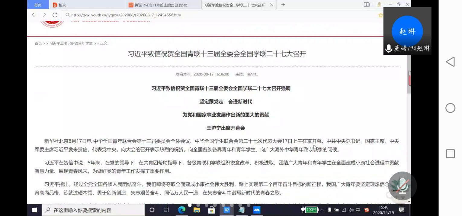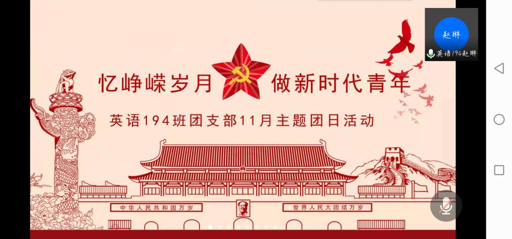 11月19日下午,350vip8888新葡的京集团英语194团支部依托线上平台举行了“忆峥嵘岁月,做新时代青年”主题团日活动。团支部全体团员参与,团日活动由团支部书记主持。