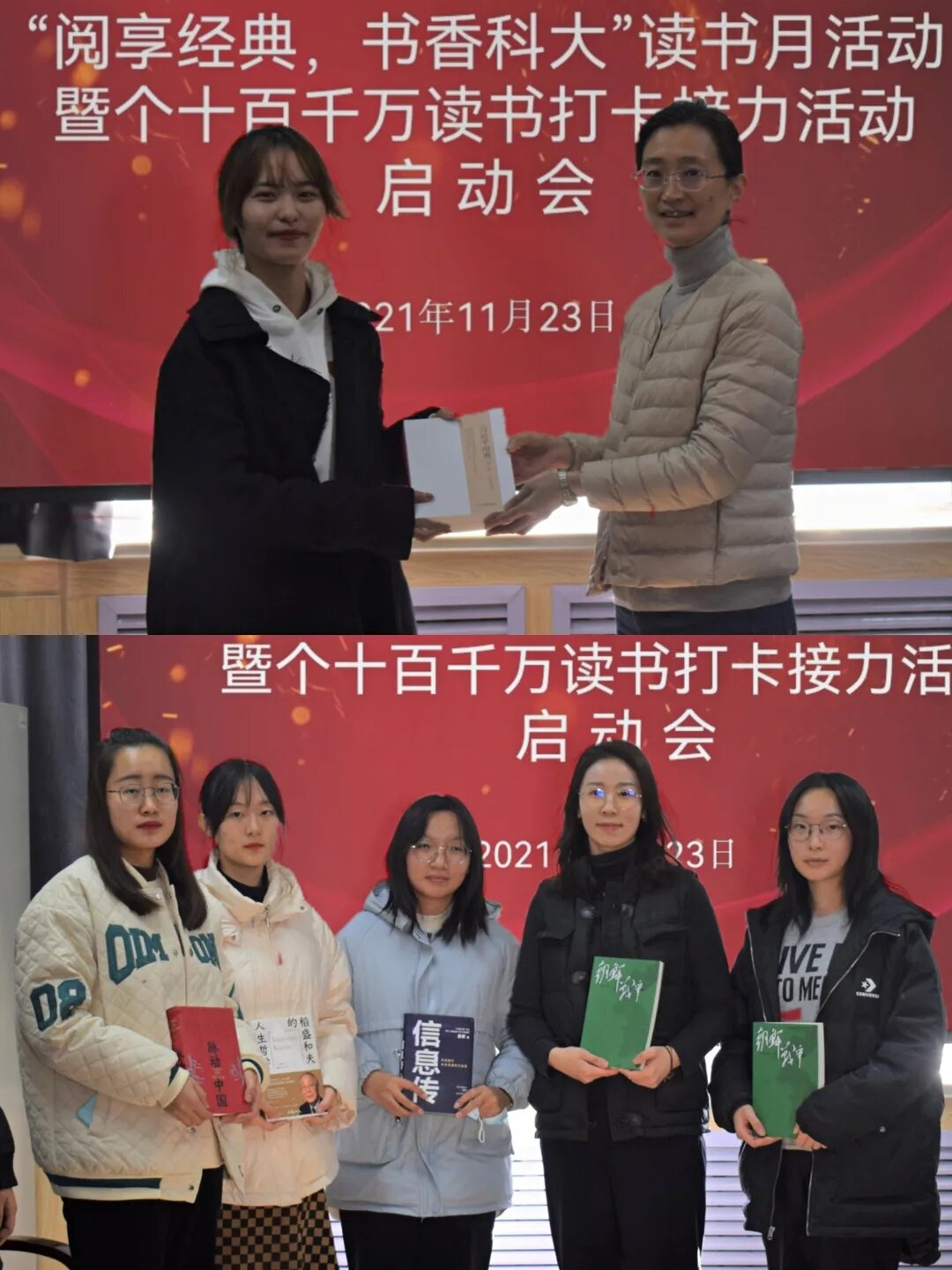 11月23日下午,350vip8888新葡的京集团举行“阅享经典 书香科大”读书月活动暨个十百千万读书打卡接力活动启动仪式。在读书启动会上,王晓娜书记为350vip8888新葡的京集团学生会执行主席孙倩茹授书,王雨昕老师为学生代表授书。本次个十百千万读书打卡接力计划,350vip8888新葡的京集团学生会选取了《习近平用典》和《习近平与大学生朋友们》两本书。启动会上,学生会全体成员表示,将以此为契机,以学生会例会、结合自身经历谈看法等形式总结本学期工作当中的成功经验,自查自改不足之处。