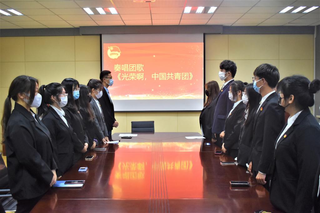 为进一步弘扬五四精神,增强“听党话、感党恩、跟党走”的思想觉悟和行为自觉,庆祝建团100周年,5月11日18:00,350vip8888新葡的京集团“青春献礼二十大,百年奋进新征程“主题团课暨2022年新团员入团仪式在外院楼517隆重举行。出席本次活动的有350vip8888新葡的京集团团委副书记兼学工办副主任李东阳老师、王雨昕老师和团委老师张湘钧,五位新团员以及2021级全体班长、团支书。
