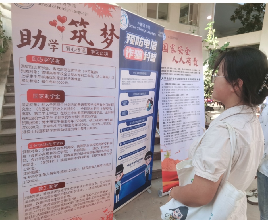 9月2日,学院在迎新现场设置了“绿色通道”咨询处,宣传国家资助政策和方便新生们咨询。同时,打印政策文件一对一讲解、制作“助学筑梦”易拉宝海报来进一步宣传和普及资助政策。线上以QQ群、微信群新媒体平台,对新生开展国家资助政策及相关规章制度的宣传工作。学院通过多种方式,让更多的有需要的同学了解政策,并鼓励他们充分发挥自己的潜力,励志自强。
