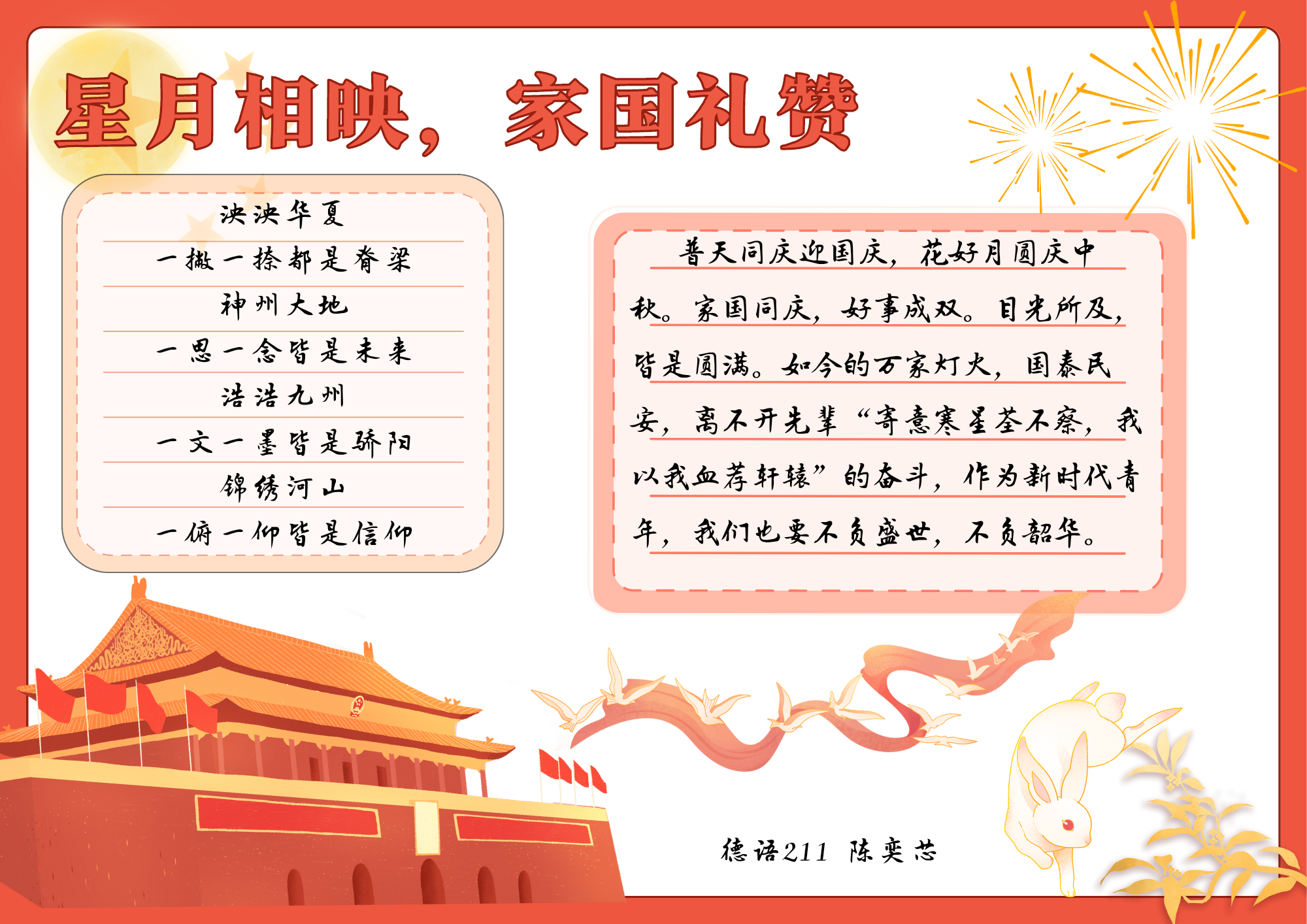 为积极弘扬中华优秀传统文化,深入学习党的二十大精神,准确把握时代脉搏,强化使命担当,厚植爱国情怀,350vip8888新葡的京集团开展“喜迎国庆 青春向党”文艺作品征集活动。通过文艺作品传达爱国主义精神,强调国家的团结和统一,培养了外院学子对国家的热爱和忧国忧民的情感。