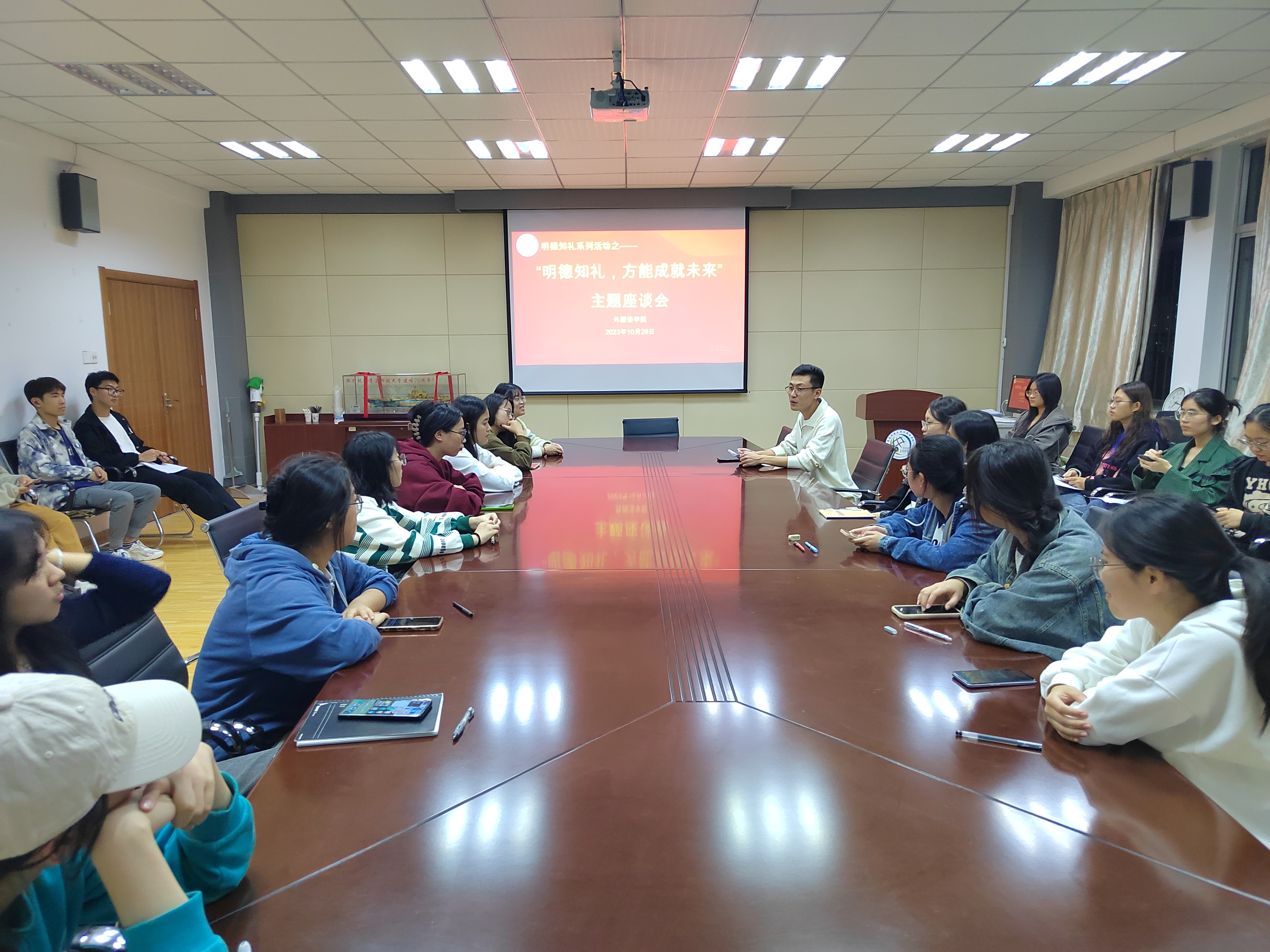 为更加深入落实立德树人根本任务,进一步培育和践行社会主义核心价值观,教育引导学生遵守公民道德规范,促进优良校风学风,建设文明和谐校园,10月28日,350vip8888新葡的京集团517会议室举行了“明德知礼,方能成就未来”主题座谈会,350vip8888新葡的京集团辅导员张湘钧老师主持会议。