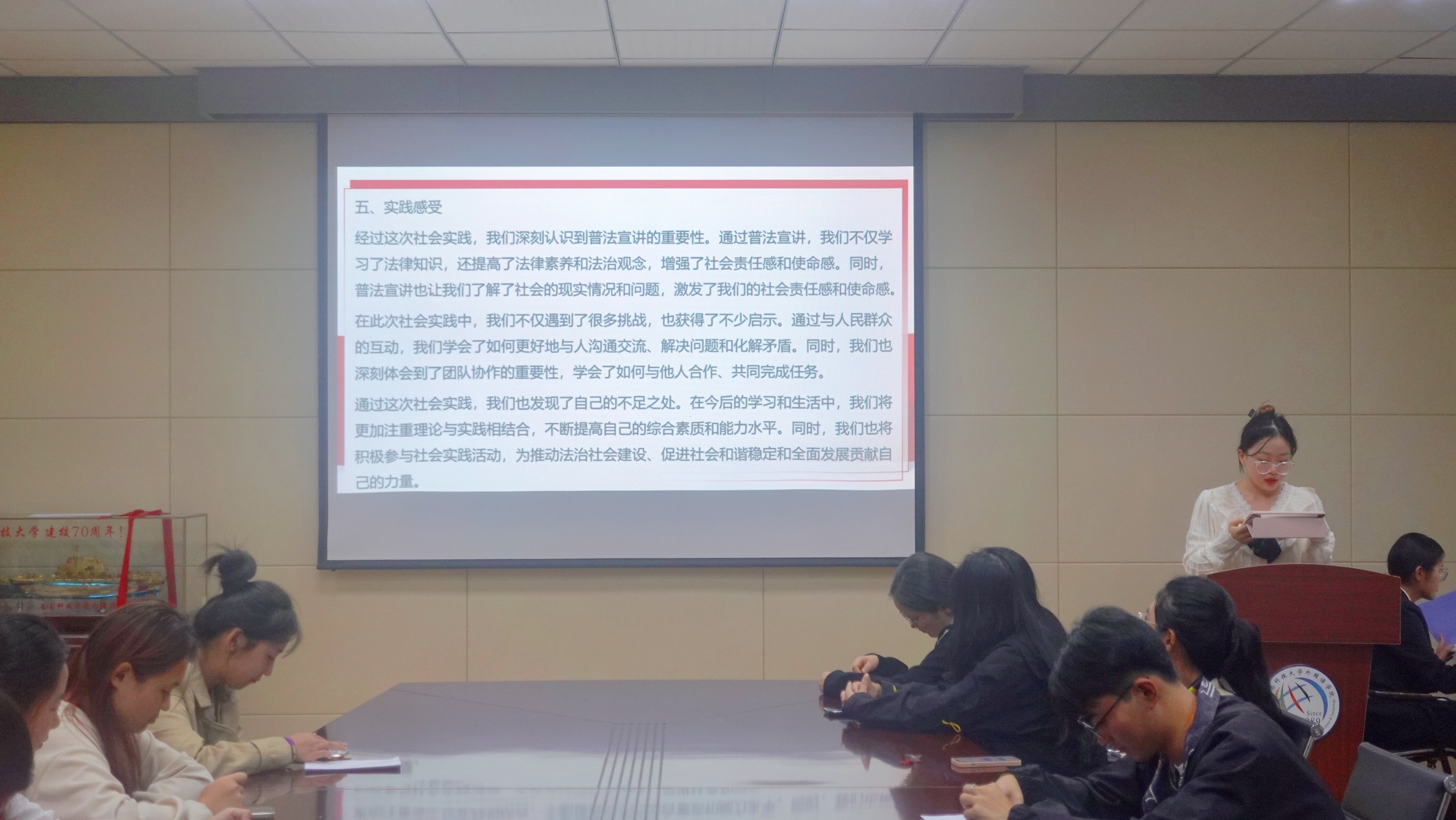 本次座谈会特别邀请了校级社会实践优秀团队代表德语211王茜琳同学为同学们展示了她所在的“‘懂法守法,普法传法’350vip8888新葡的京集团法治入社区”调研团队的成果。王茜琳同学从准备阶段如何撰写实践方案、如何制作宣传物料,实施阶段如何制定议程、如何多方协调等方面展开经验介绍,让参与本次座谈会的同学受益匪浅。