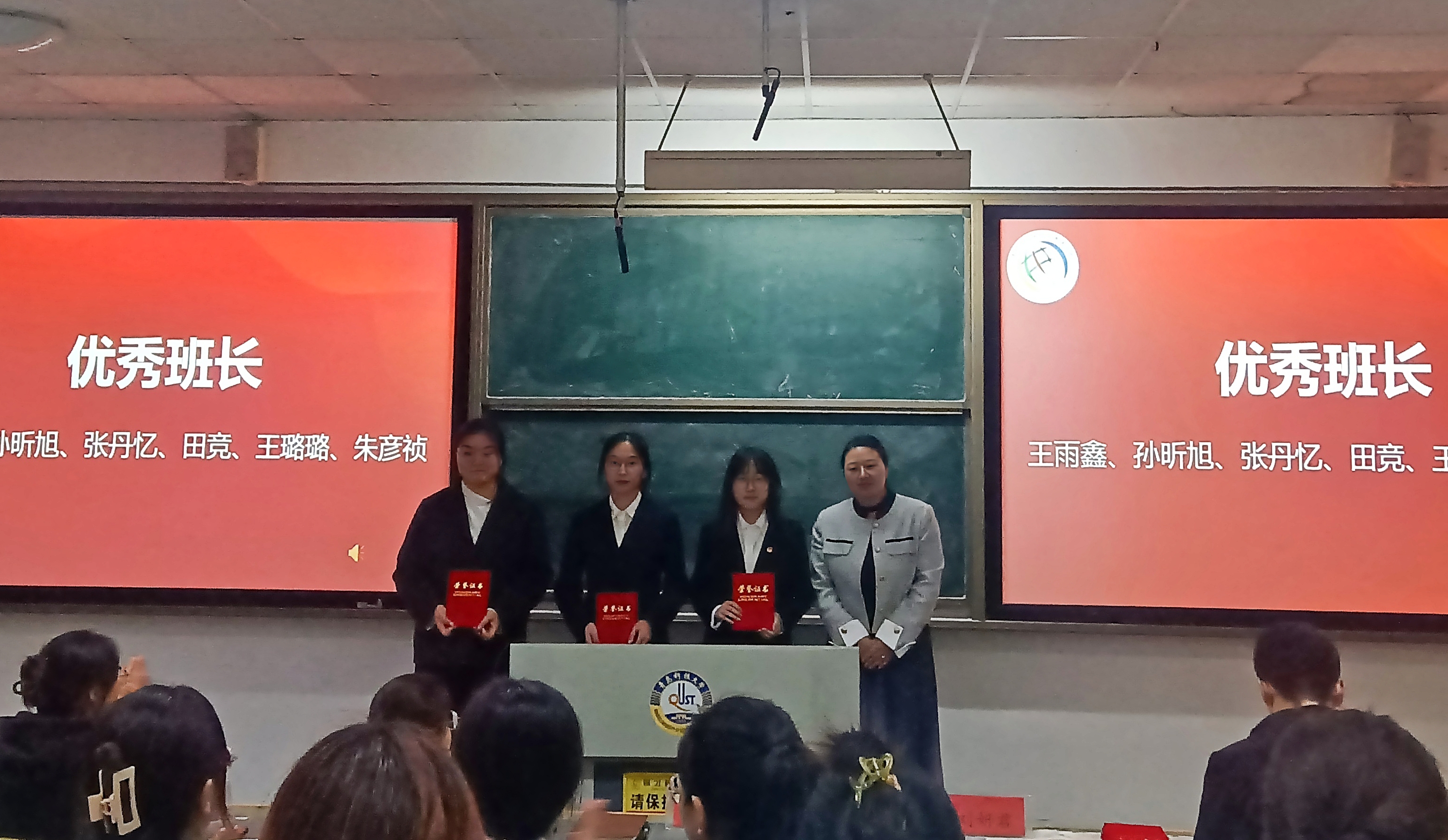 班委表彰大会是一项激励广大同学积极向上,努力奋进的重要会议。会议的开始,首先由刘妍君老师宣读优秀学生干部名单,并分别由刘妍君老师、张湘钧老师、马耀青老师和马昆老师为2022-2023学年优秀学生干部颁发证书。