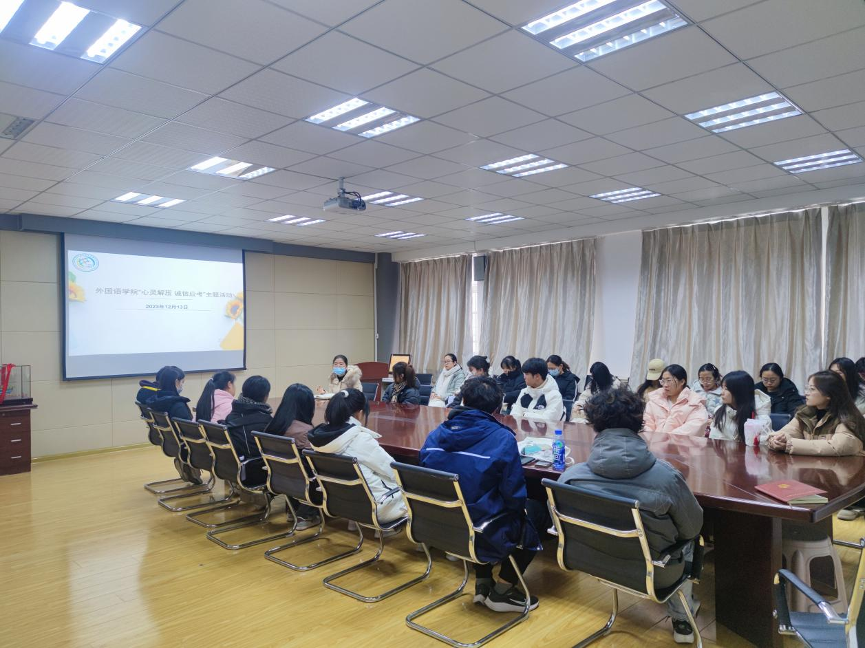 在考试周来临之际,为疏导学生可能产生的心理压力,引导学生树立正确的学习和考试态度,以平和心态对待学习生活。350vip8888新葡的京集团自12月11日起开展了“心灵解压,诚信应考”主题活动,学院全年级各班级进行了主题班会,学院于12月13日在外院517会议室召开“心灵解压,诚信应考”主题会议,辅导员马耀青老师以及各班班委参加了会议。